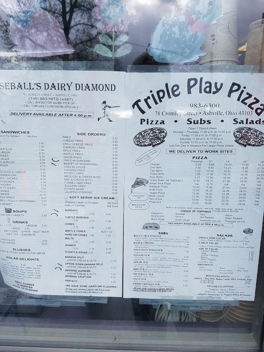 Wrapping up the menu at Triple Play Pizza on 78 Cromley St, Ashville, OH, it’s clear that variety and customization are at the heart of their offerings. Pizza lovers can choose from a wide range of options including Personal Cheese Pizza, Personal Pizza Built Your Way, Personal Grand Slam, Personal Hawaiian, and Personal Meat Lovers, scaling up to 18" Cheese Pizza and 18" Pizza Built Your Way for larger appetites. The menu extends beyond pizza with satisfying appetizers like Bosco Sticks, Cheesy Bread, and Breadsticks, while subs such as Italian Sub, Ham & Cheese Philly Cheese Steak, and Open Face Pizza Sub provide hearty alternatives. For wings enthusiasts, there are 10 Jumbo Bone In Wings, 20 Jumbo Bone In Wings, 5 Boneless Wings, and more. Fresh salads range from Small Salad to Family Salad, including specialty options like Chef Salad and Wolfe Salad. Their dinners feature classics like Spaghetti Dinner, Chicken Tender Basket, and Shrimp Basket Premium Lunch Special, complemented by sandwiches such as Pizza Stromboli, Ham and Cheese Stromboli, and Viking Burger varieties. Fans of snacks can indulge in Basket of Mushrooms, Fried Mushrooms, Potato Skins, Cheese Sticks, and Mac and Cheese Bites, while dessert offerings include 10" Apple Crumble Pizza, 10" Cherry Crumble Pizza, Banana Split, Brownie Eruption, and Brownie Supreme, alongside Cones, Floats, and Sodas. The menu is rounded out with practical extras like Garlic Cup, BBQ Cup, Marinara Cup, Sour Cream, and Ranch Cup, and a selection of beverages including 2 Liter, Bomb Pop, Open Drink POWERADE, and Slushy. Overall, Triple Play Pizza delivers a comprehensive menu that balances classic pizza staples with diverse sides, desserts, and drinks, making it a one-stop destination for a satisfying casual meal.